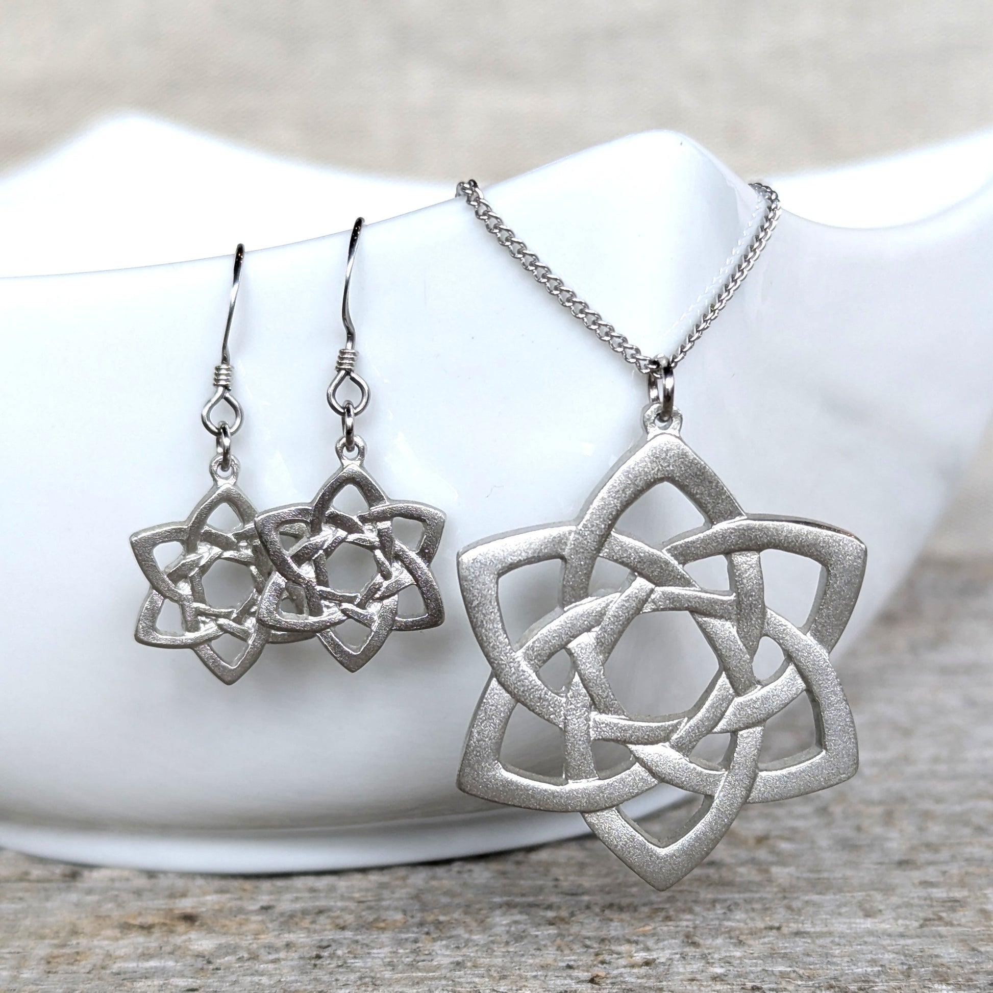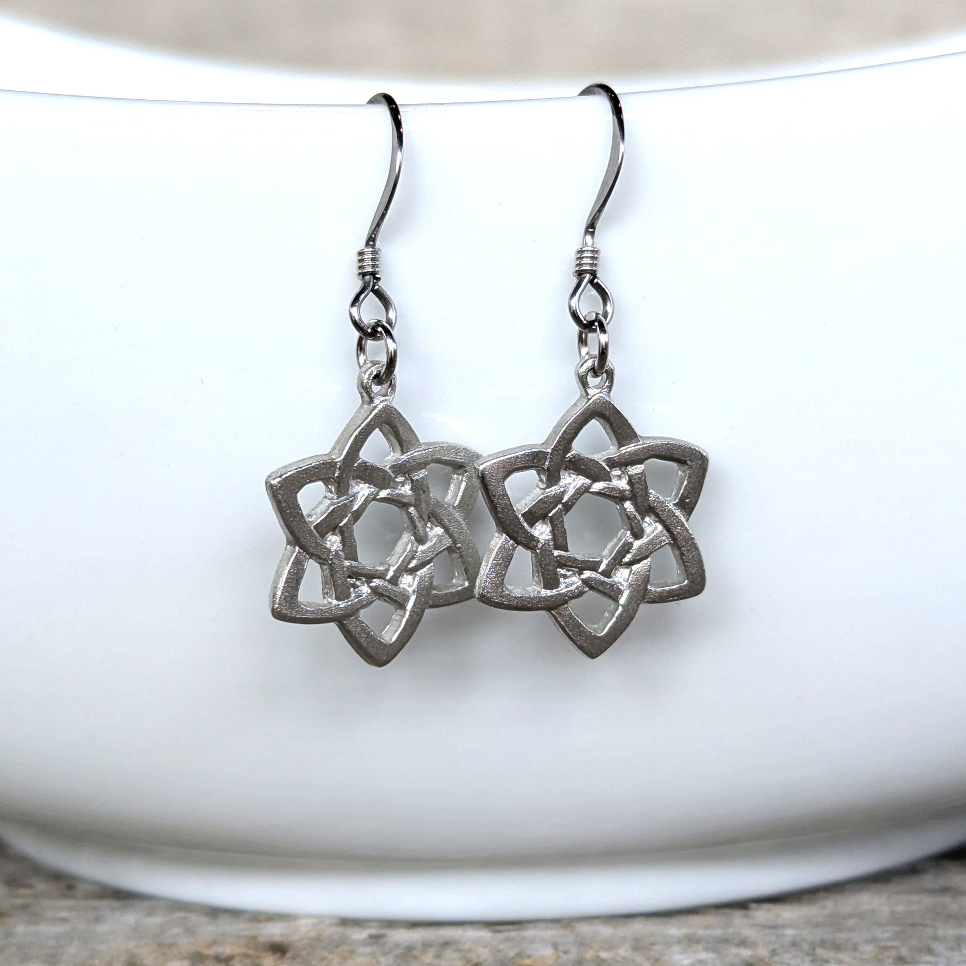 Celtic Rose - The interlacing lines of the Celtic Rose symbolize the continuity of everlasting love and reminds us of our interconnection with nature. Earring wires are hypoallergenic surgical steel.