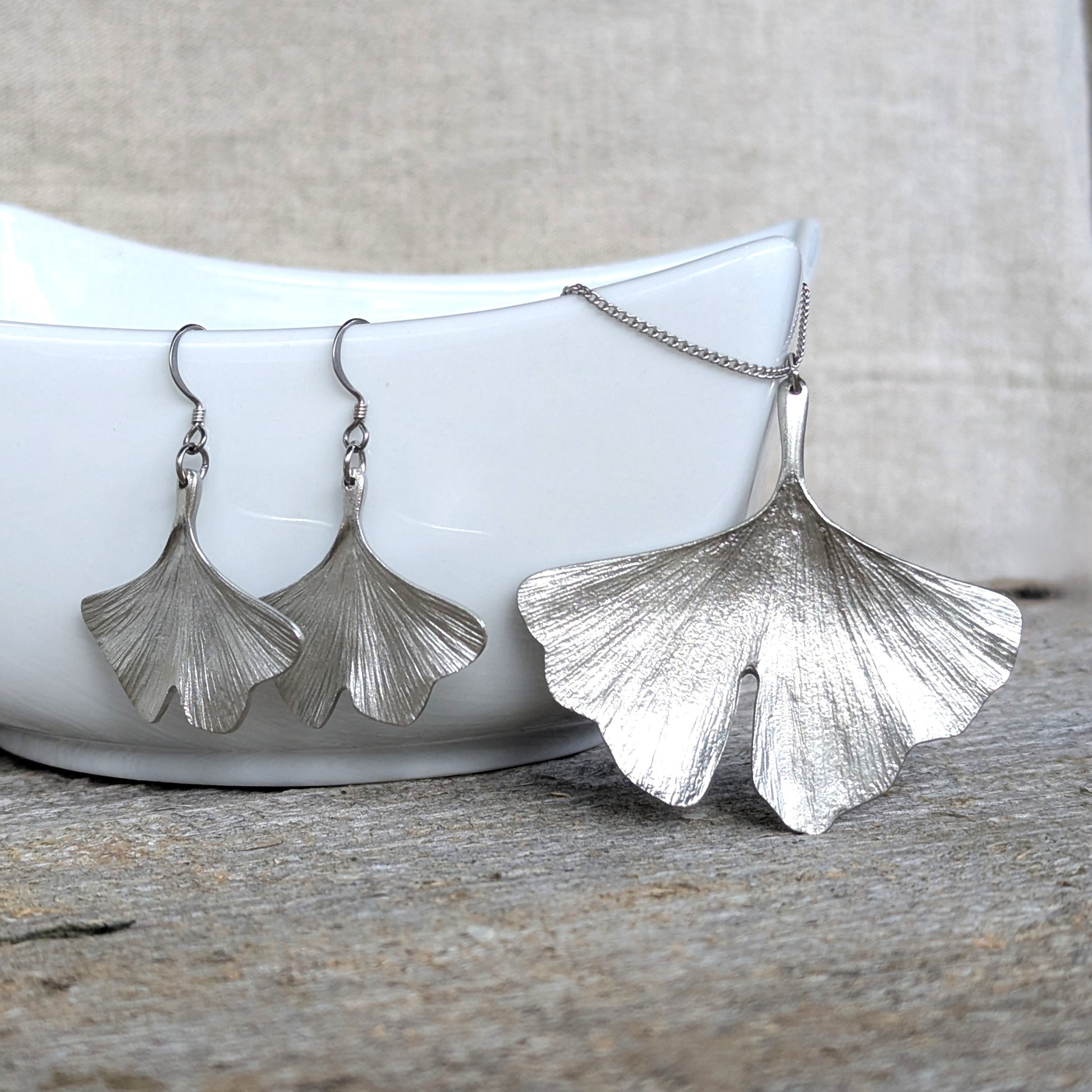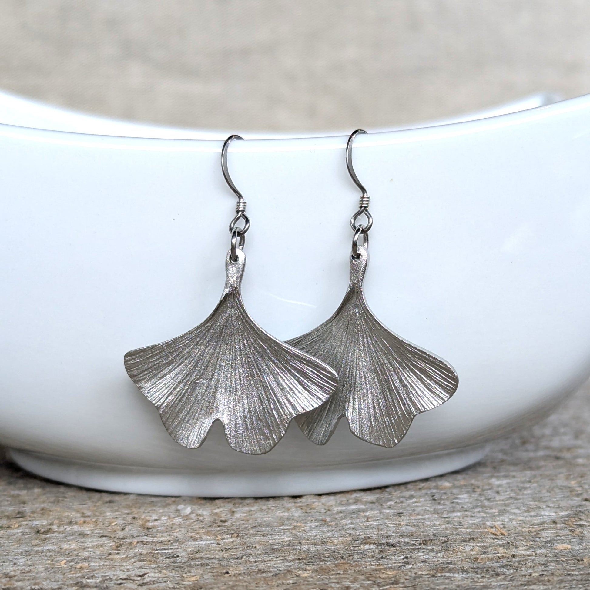 Ginkgo – This is the unmistakable fan shaped leaf of the Ginkgo tree. Dating back almost 290 million years, this tree is a living fossil. Earring wires are hypoallergenic surgical steel.