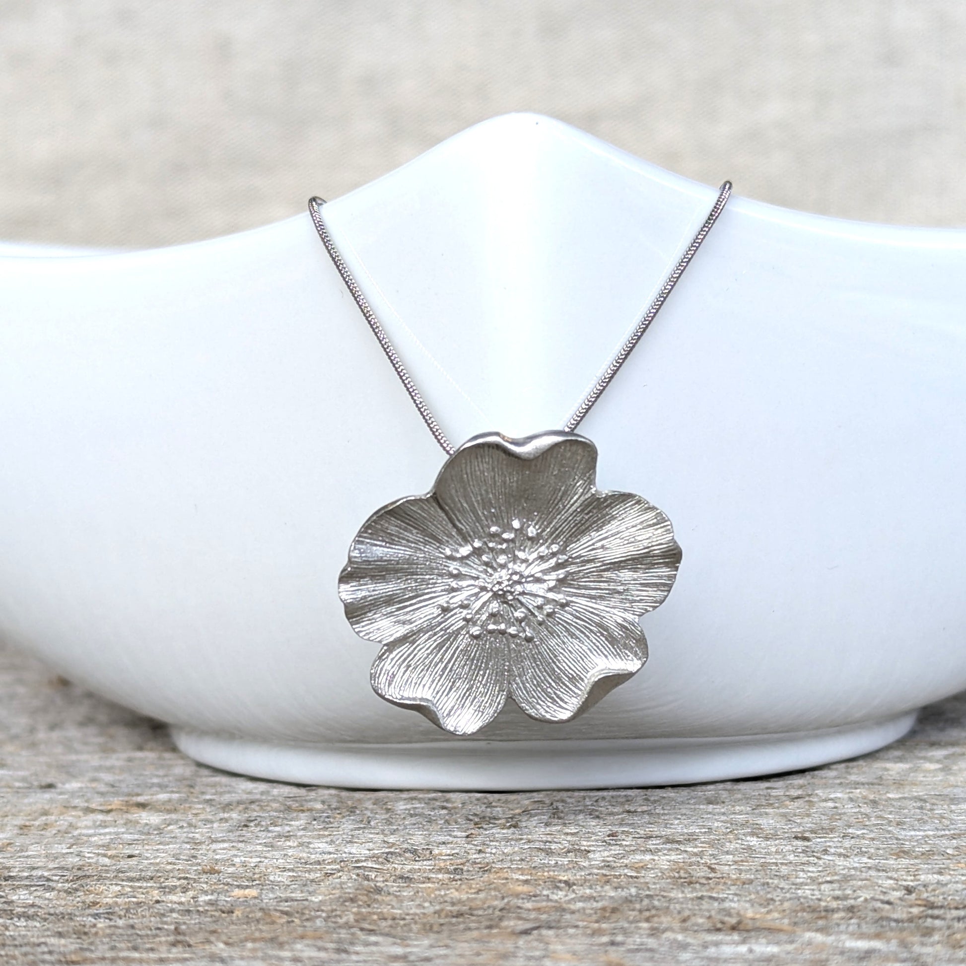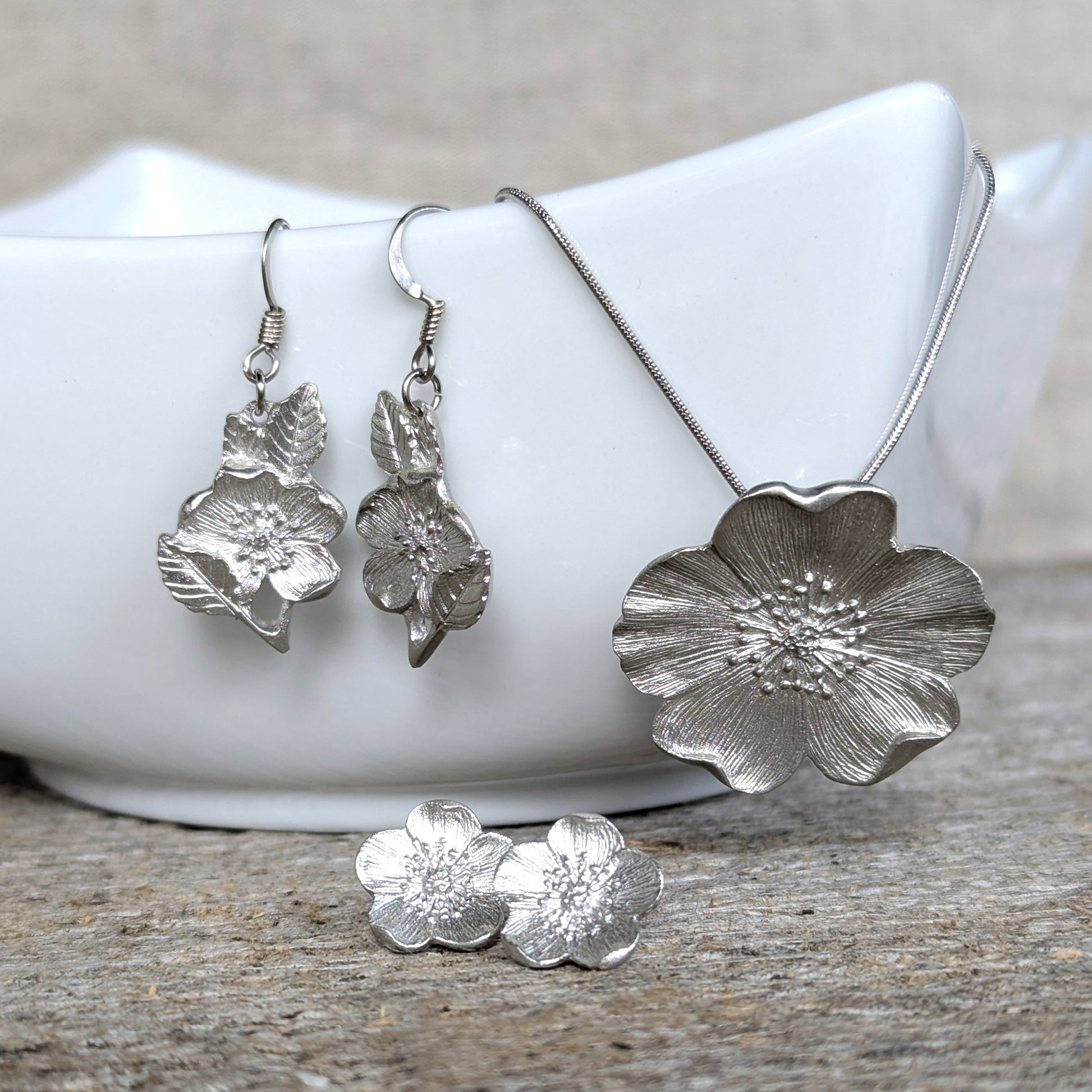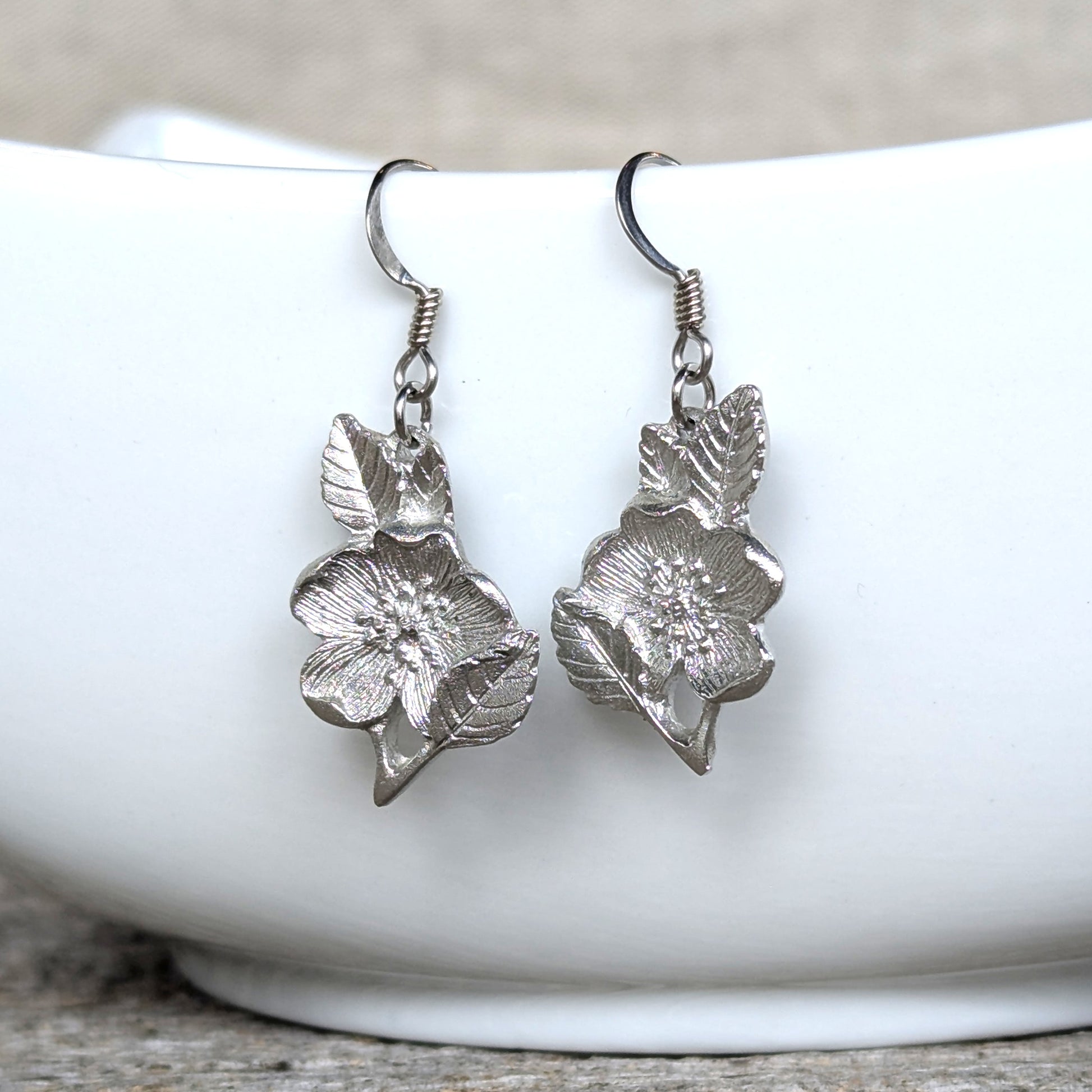 Wild Rose – Thriving in even the harshest conditions, the wild rose is a comforting sight throughout Nova Scotia. Earring wires are hypoallergenic surgical steel.