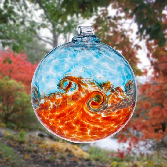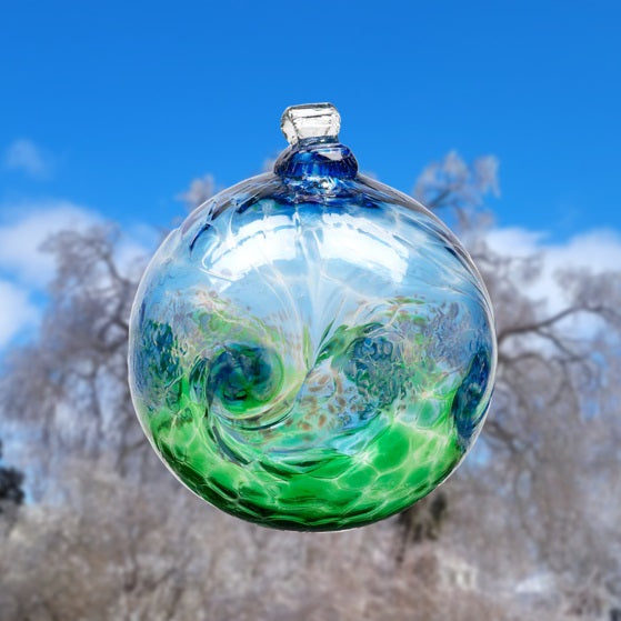 These ornaments are inspired by the swirling sky of Vincent Van Gogh's famous painting 'The Starry Night'. The symmetry of shape and gentle mixing of colours gives these beautiful ornaments a calming effect. Swirls of glass blend the colours on the surface creating the image of air currents of rolling waves.
