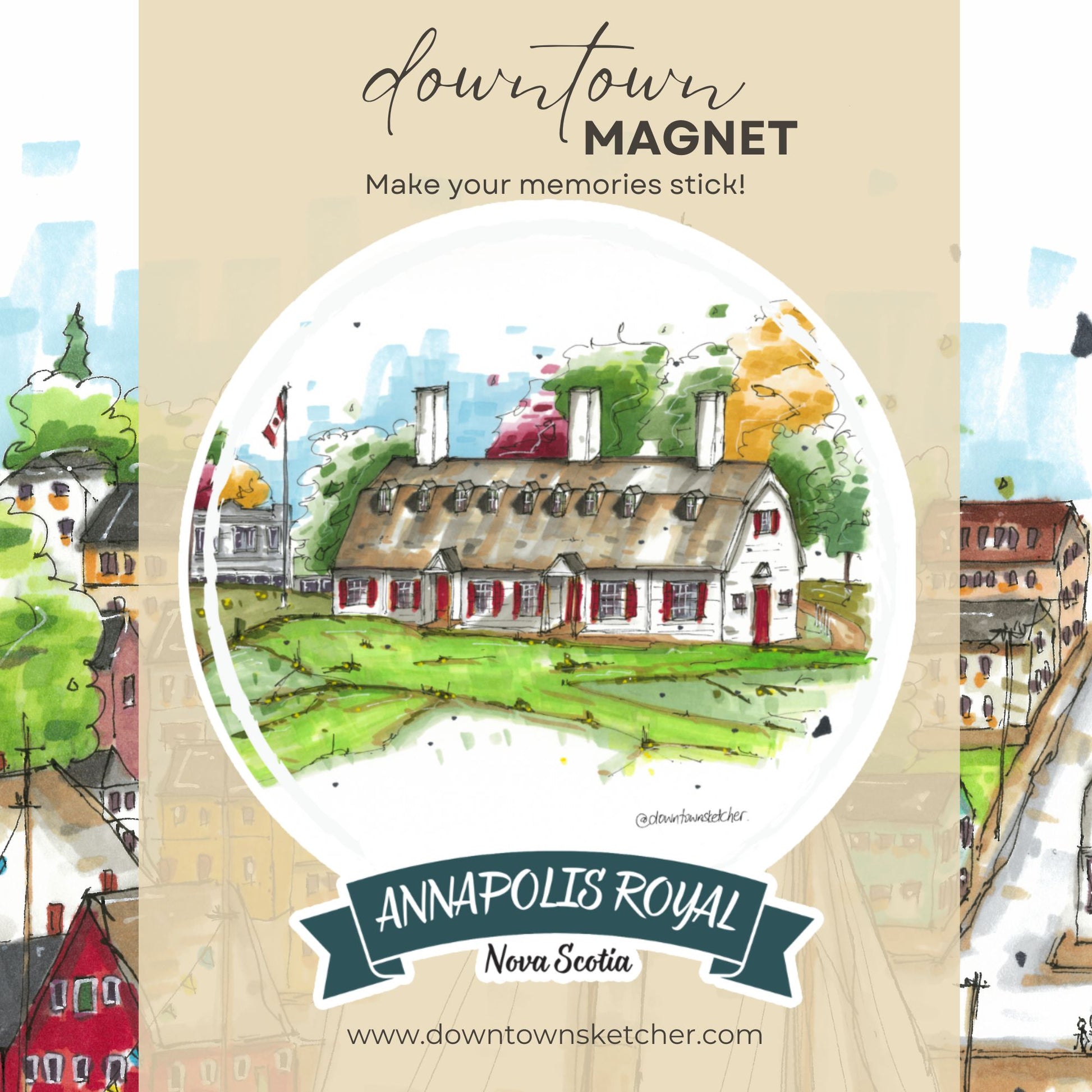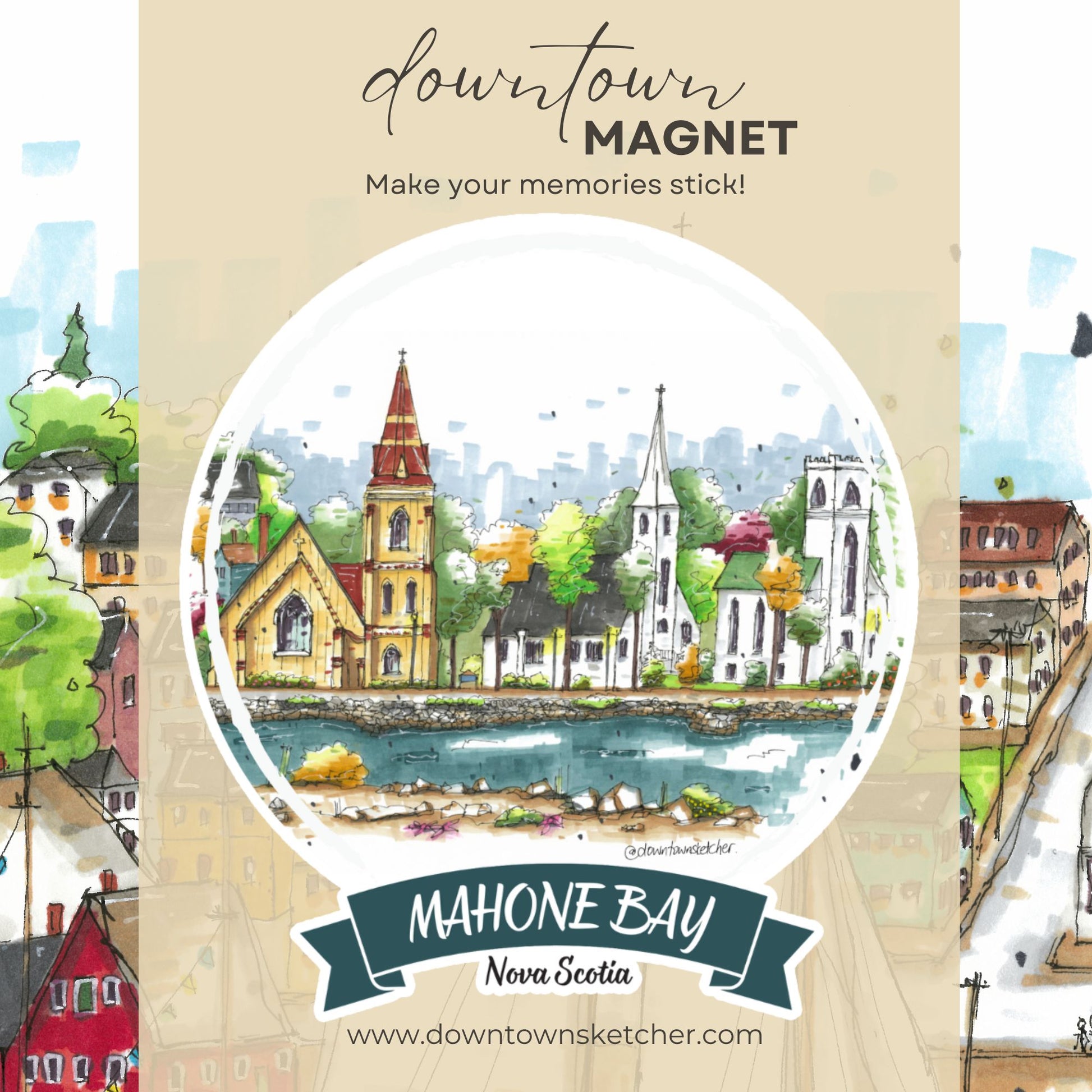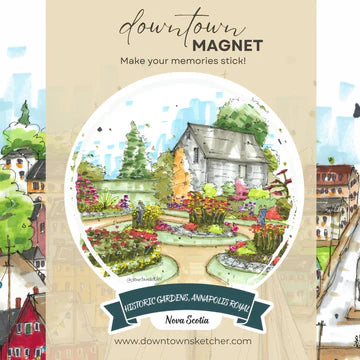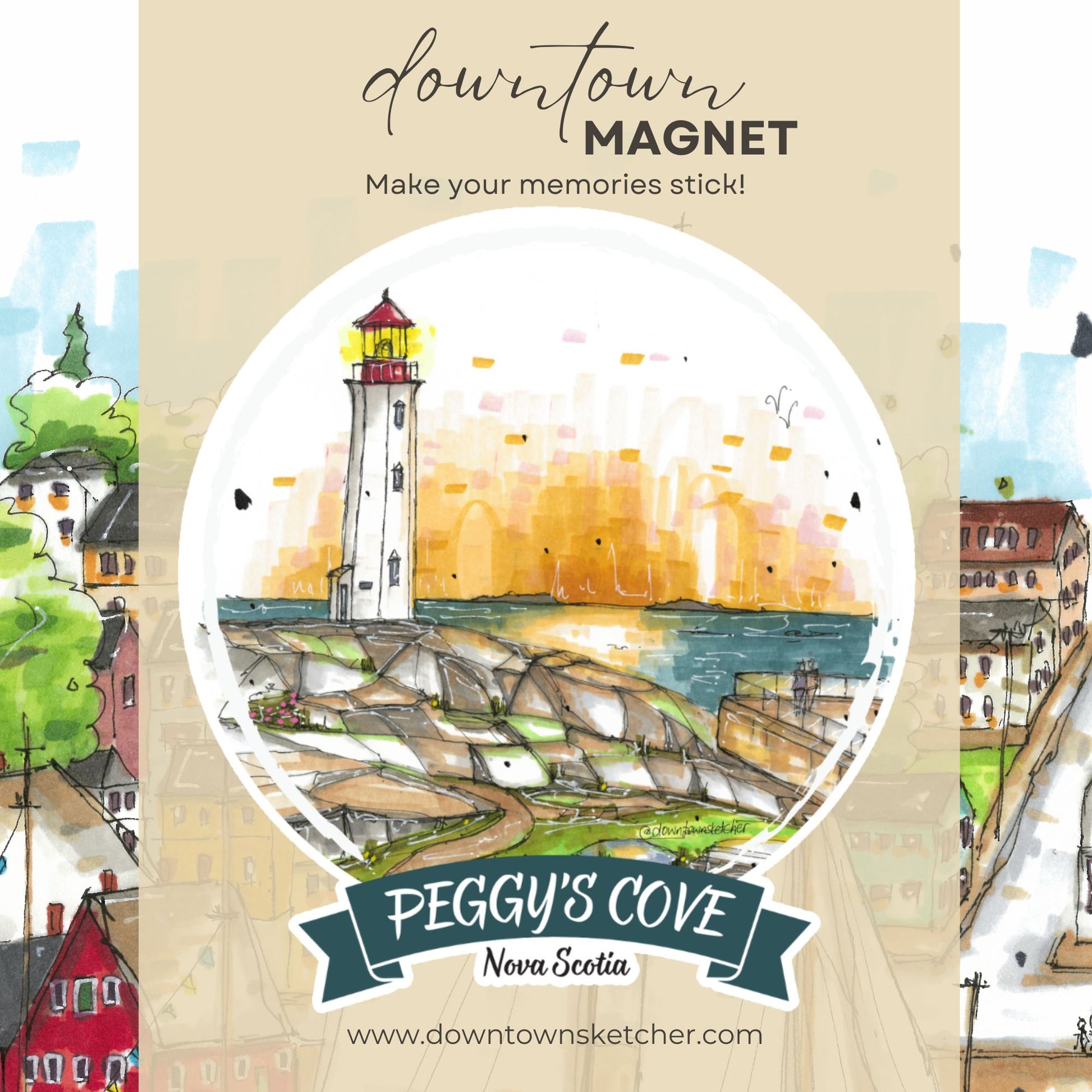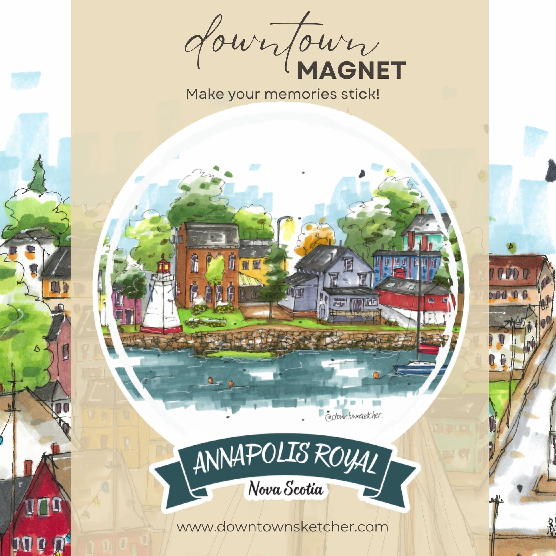 Thoughtfully packaged with a sturdy backing board and enclosed in a clear cellophane bag, this magnet is ready for easy display. Whether hung on the wall or placed on a magnetic surface, it adds a touch of vibrancy and character to any home or office space. Measuring 2.75" x 3", this compact yet striking magnet is a wonderful way to bring the allure of this Nova Scotia town into your daily surroundings. Its vibrant colors and iconic landmarks will transport you to the heart of this charming destination, evoking fond memories and a sense of wanderlust with every glance.