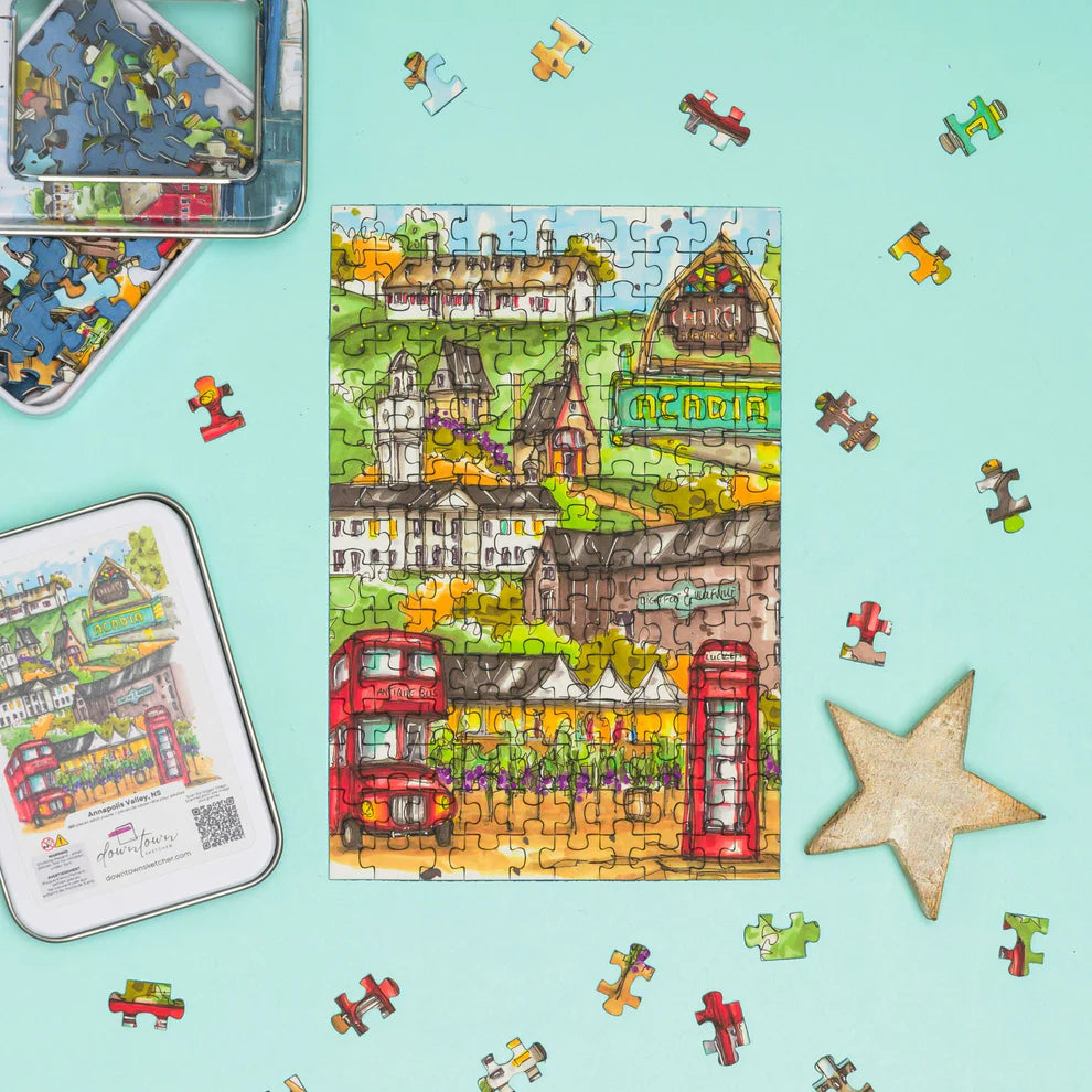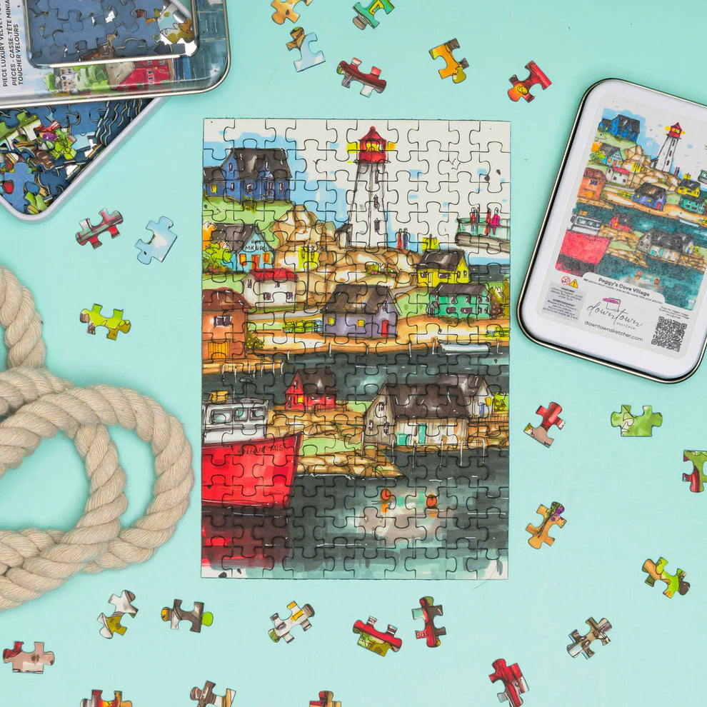 Each puzzle is a 150-piece jigsaw, crafted at a charming 4x6" size, and made with premium blue core material and a sophisticated linen texture for an elevated tactile experience. Designed with adults and avid puzzlers in mind, these mini masterpieces come elegantly packaged in a compact tin travel case with a clear window, perfect for displaying the art even when the puzzle is packed away. Whether you’re a dedicated puzzle enthusiast or simply want a unique memento of your visit, Downtown Sketcher’s Mini Puzzle Collection offers a stylish and memorable way to celebrate your love for art and the Maritimes' iconic scenery-wherever your travels take you.