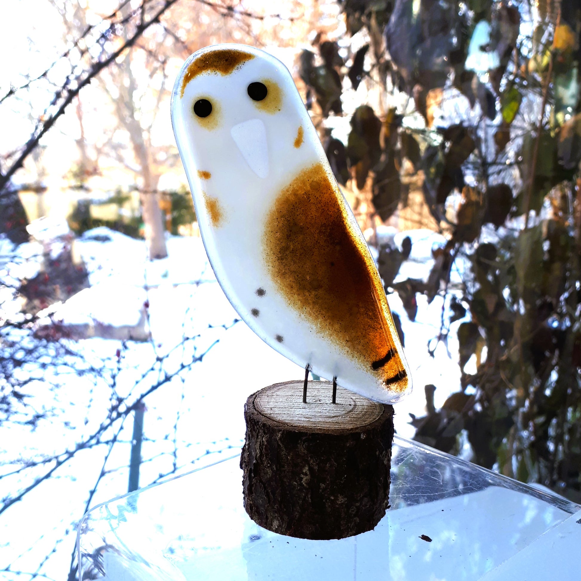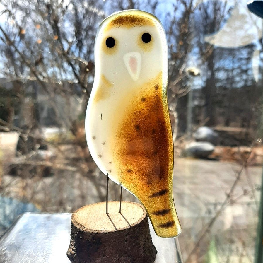 These beautiful, fused glass birds are made in Nova Scotia by The Glass Bakery. Each bird is a unique piece of art. The shape of the bird is first cut in clear glass. Layers of powdered coloured glass are then applied between the clear layers. Each piece is kiln baked, fused at ultra high temperatures then carefully cooled for resilience. The birds stand on natural wood pieces. No paints, glazes or moulds are used. No two birds are the same.
