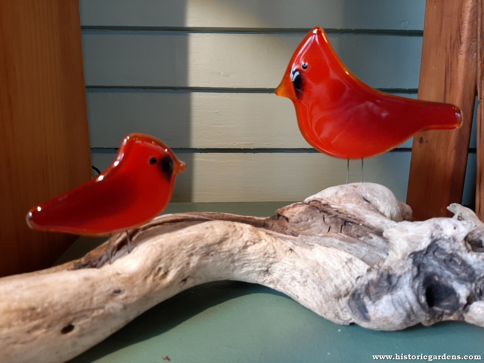 This set represents a male cardinal and his not-quite-grown son, having a nice chat on a piece of driftwood.