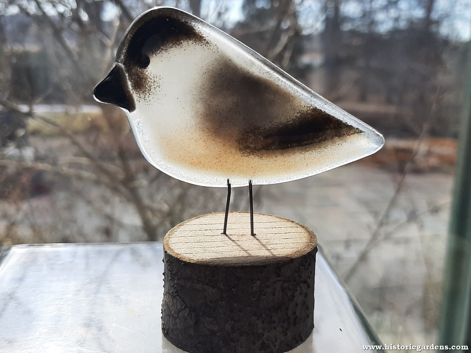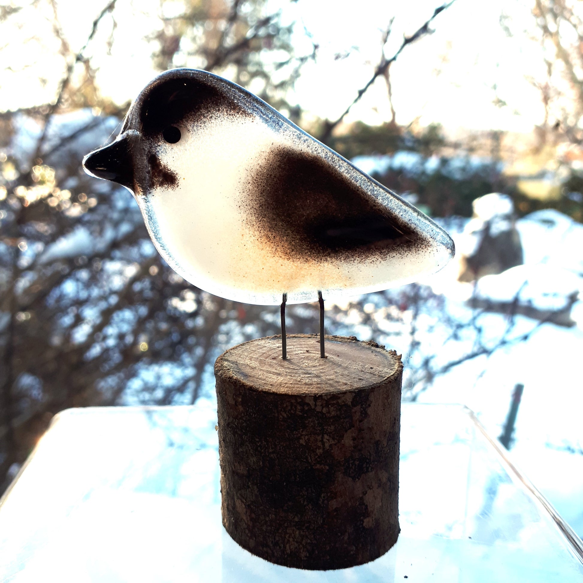 These beautiful, fused glass birds are made in Nova Scotia by The Glass Bakery. Each bird is a unique piece of art. The shape of the bird is first cut in clear glass. Layers of powdered coloured glass are then applied between the clear layers. Each piece is kiln baked, fused at ultra high temperatures then carefully cooled for resilience. The birds stand on natural wood pieces. No paints, glazes or moulds are used. No two birds are the same.