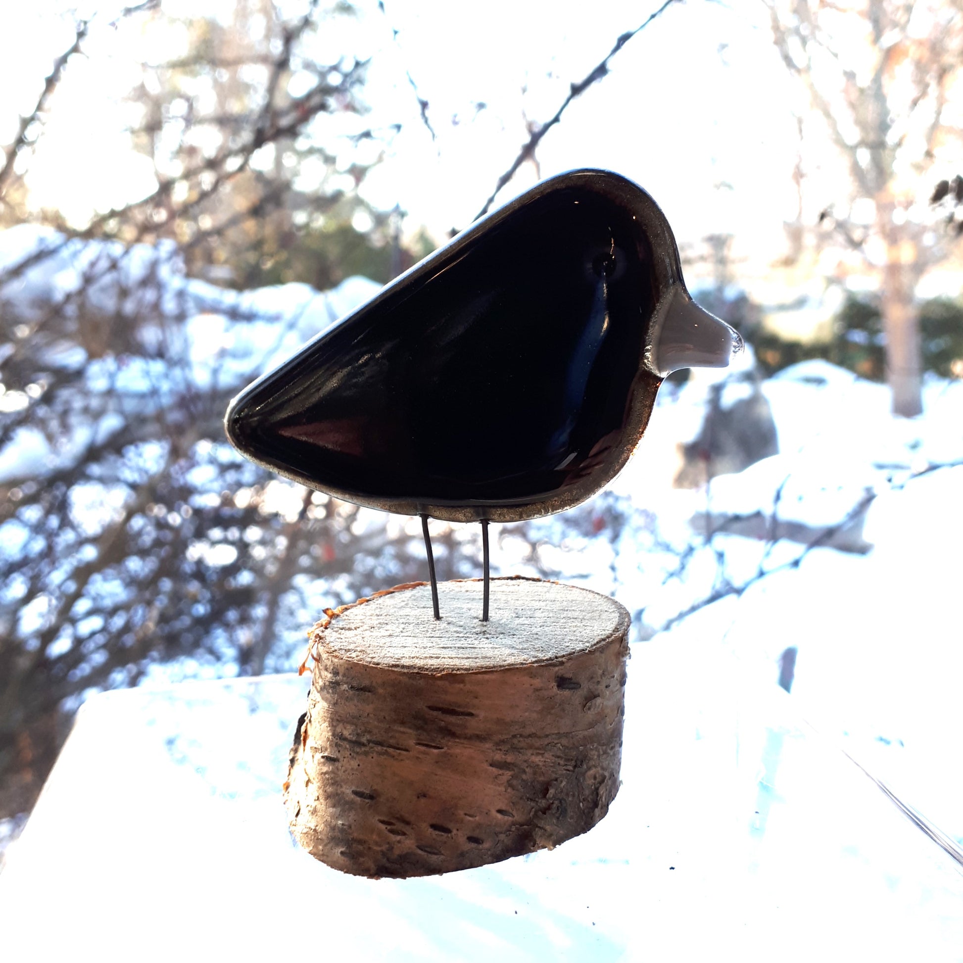 These beautiful, fused glass birds are made in Nova Scotia by The Glass Bakery. Each bird is a unique piece of art. The shape of the bird is first cut in clear glass. Layers of powdered coloured glass are then applied between the clear layers. Each piece is kiln baked, fused at ultra high temperatures then carefully cooled for resilience. The birds stand on natural wood pieces. No paints, glazes or moulds are used. No two birds are the same.