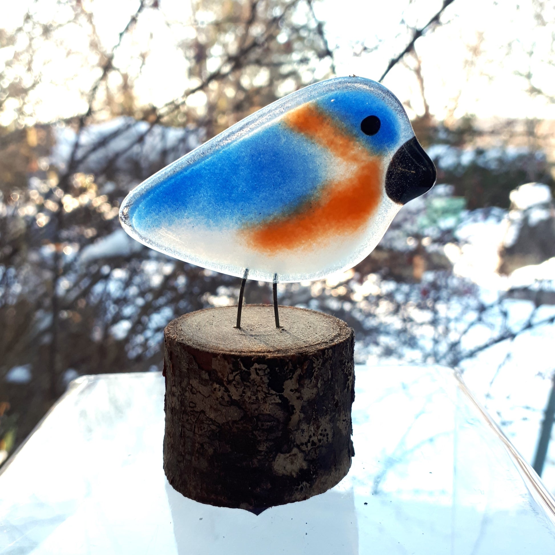 These beautiful, fused glass birds are made on Nova Scotia’s Atlantic shore in Mill Cove by The Glass Bakery. Each bird is a unique piece of art. The shape of the bird is first cut in clear glass. Layers of powdered coloured glass are then applied between the clear layers. Each piece is kiln baked, fused at ultra high temperatures then carefully cooled for resilience. The birds stand on natural wood pieces. No paints, glazes or moulds are used. No two birds are the same.