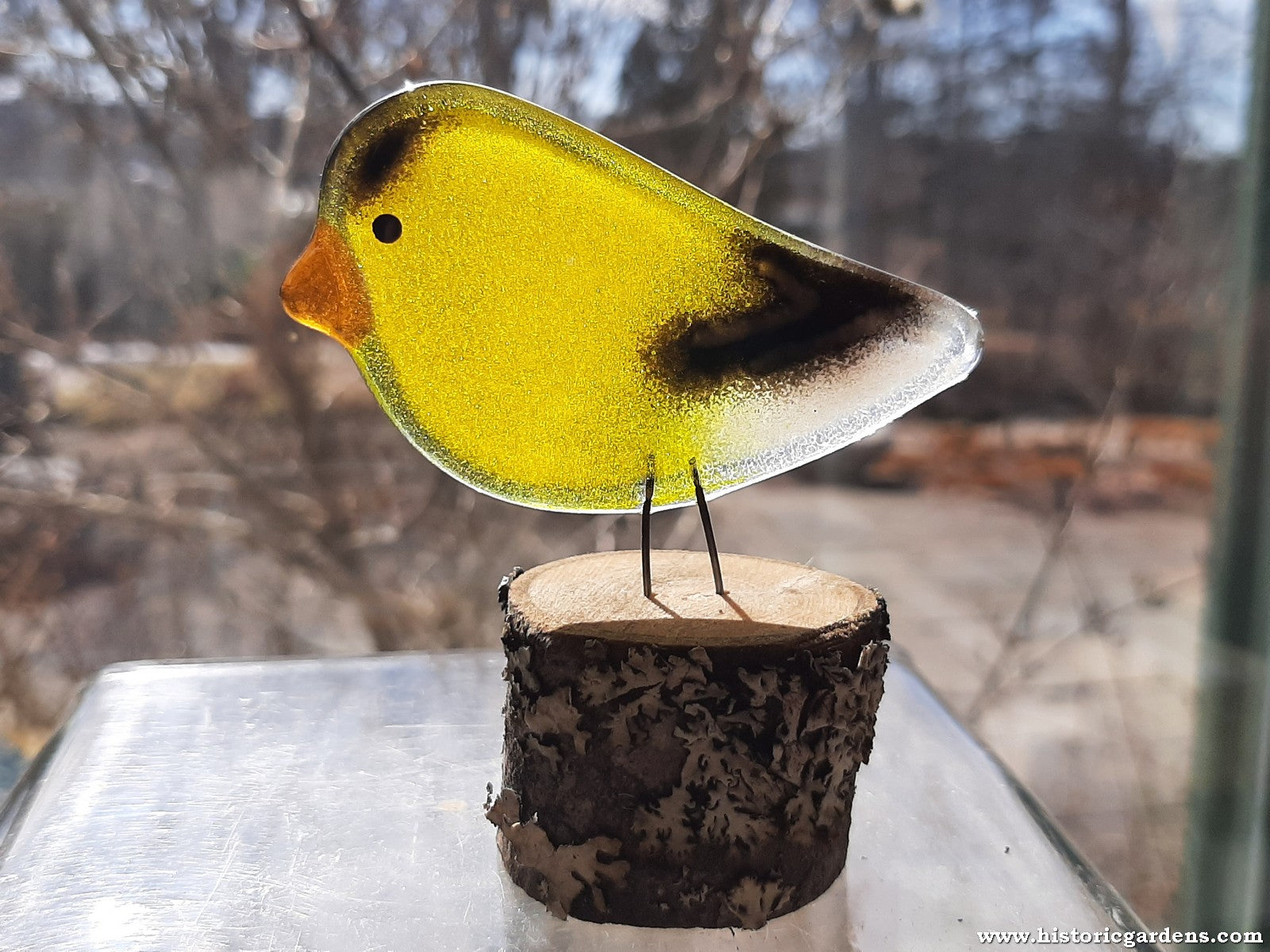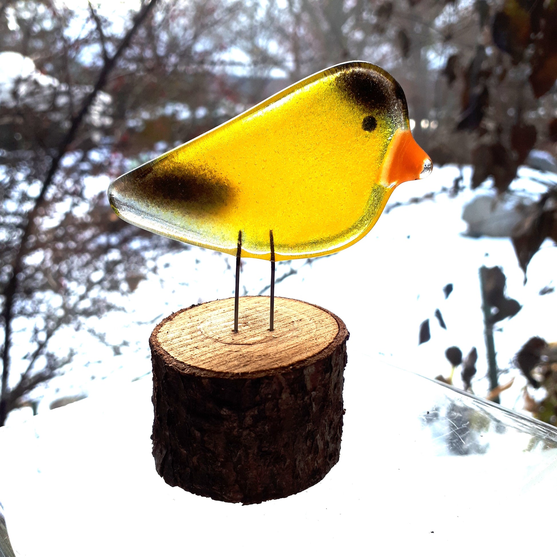 These beautiful, fused glass birds are made in Nova Scotia by The Glass Bakery. Each bird is a unique piece of art. The shape of the bird is first cut in clear glass. Layers of powdered coloured glass are then applied between the clear layers. Each piece is kiln baked, fused at ultra high temperatures then carefully cooled for resilience. The birds stand on natural wood pieces. No paints, glazes or moulds are used. No two birds are the same.