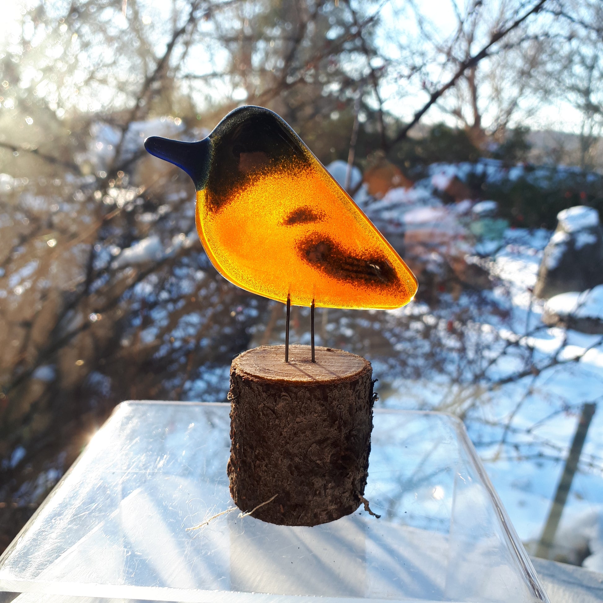 These beautiful, fused glass birds are made on Nova Scotia’s Atlantic shore in Mill Cove by The Glass Bakery. Each bird is a unique piece of art. The shape of the bird is first cut in clear glass. Layers of powdered coloured glass are then applied between the clear layers. Each piece is kiln baked, fused at ultra high temperatures then carefully cooled for resilience. The birds stand on natural wood pieces. No paints, glazes or moulds are used. No two birds are the same.