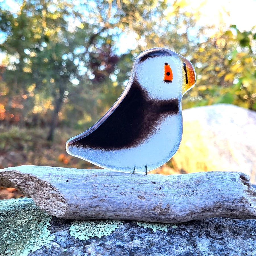 These beautiful, fused glass birds are made in Nova Scotia by The Glass Bakery. Each bird is a unique piece of art. The shape of the bird is first cut in clear glass. Layers of powdered coloured glass are then applied between the clear layers. Each piece is kiln baked, fused at ultra high temperatures then carefully cooled for resilience. The birds stand on natural wood pieces. No paints, glazes or moulds are used. No two birds are the same.