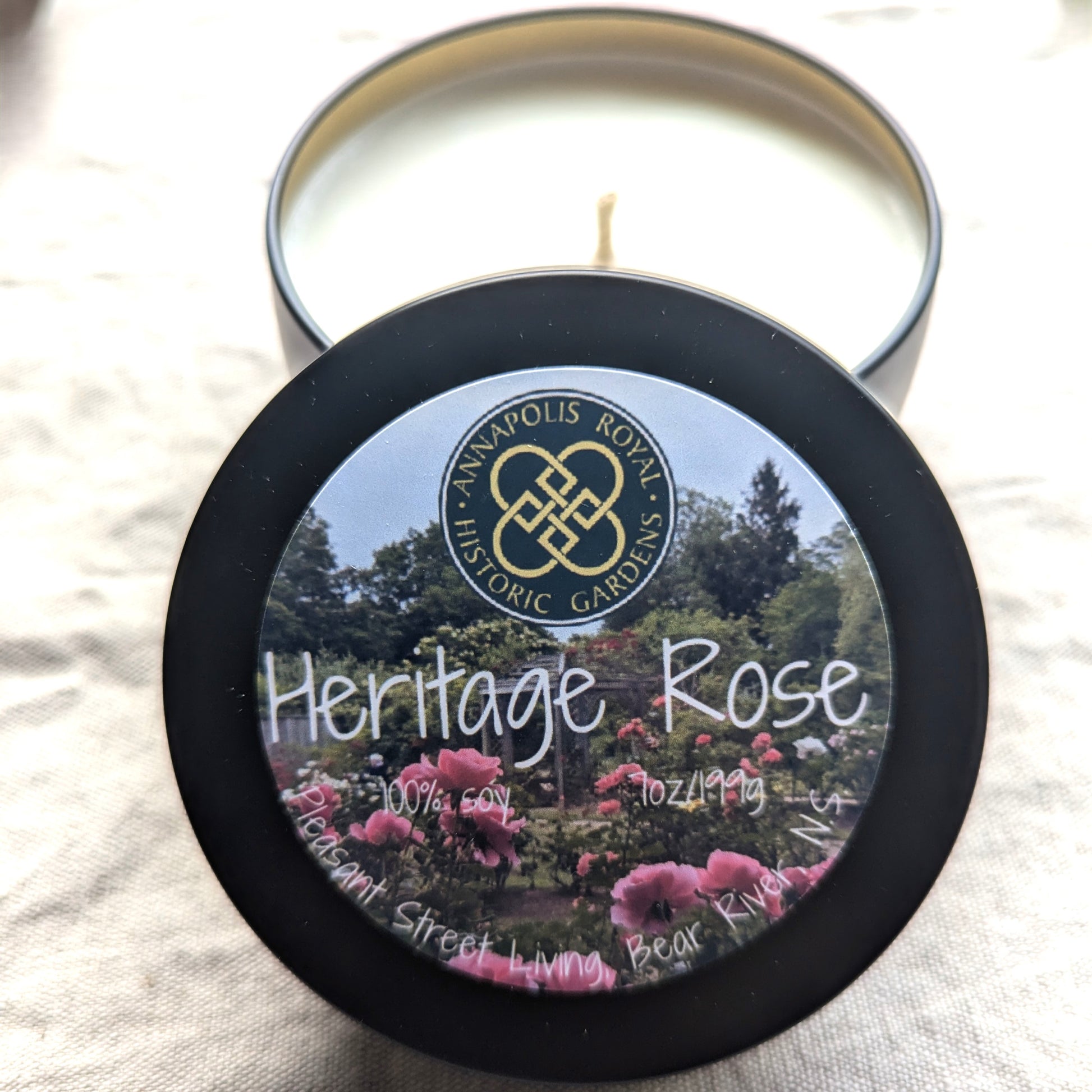 Heritage Rose Candles in metal tin - Made exclusively for the Annapolis Royal Historic Gardens by Pleasant Street Living located in Bear River, Nova Scotia.