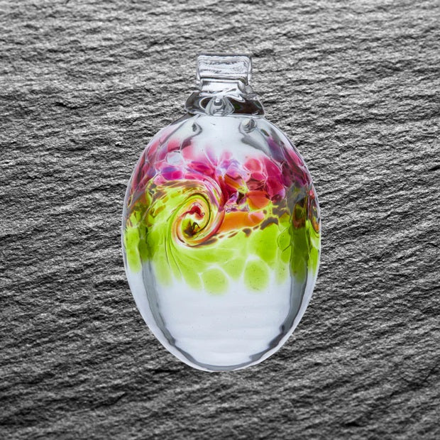 These fantastic Mini Eggs are inspired by the swirling sky of Vincent Van Gogh's famous painting “The Starry Night.” Opaque white glass swirls across the middle, mixing with the two colours on the surface, creating the image of air currents or rolling waves. These eggs are perfect little sun catchers for your window, or collect a few and create a striking egg tree to celebrate spring!