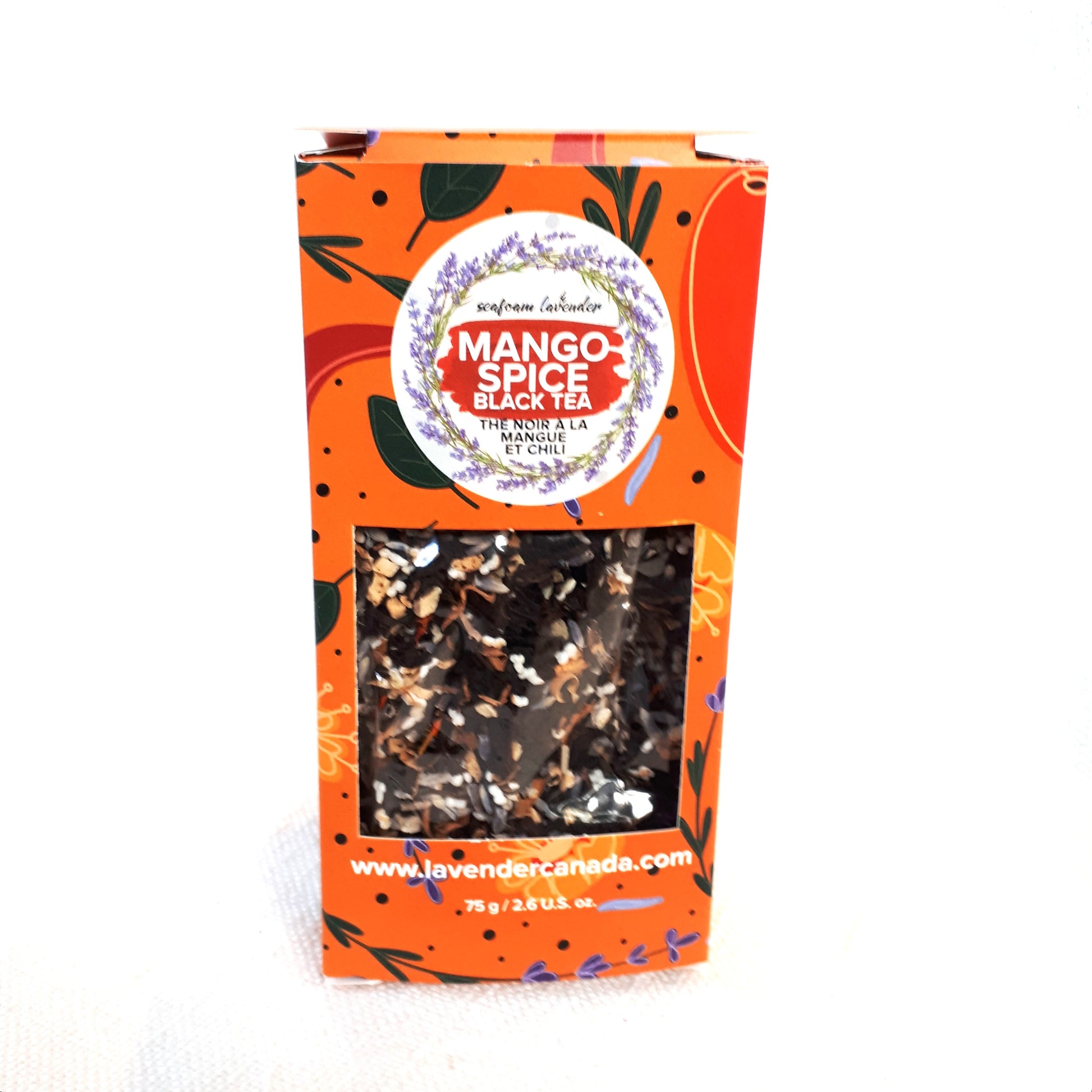 - Mango Spice - black tea with dried mango, chili, amaranth, orange blossoms, safflower petals, and lavender.