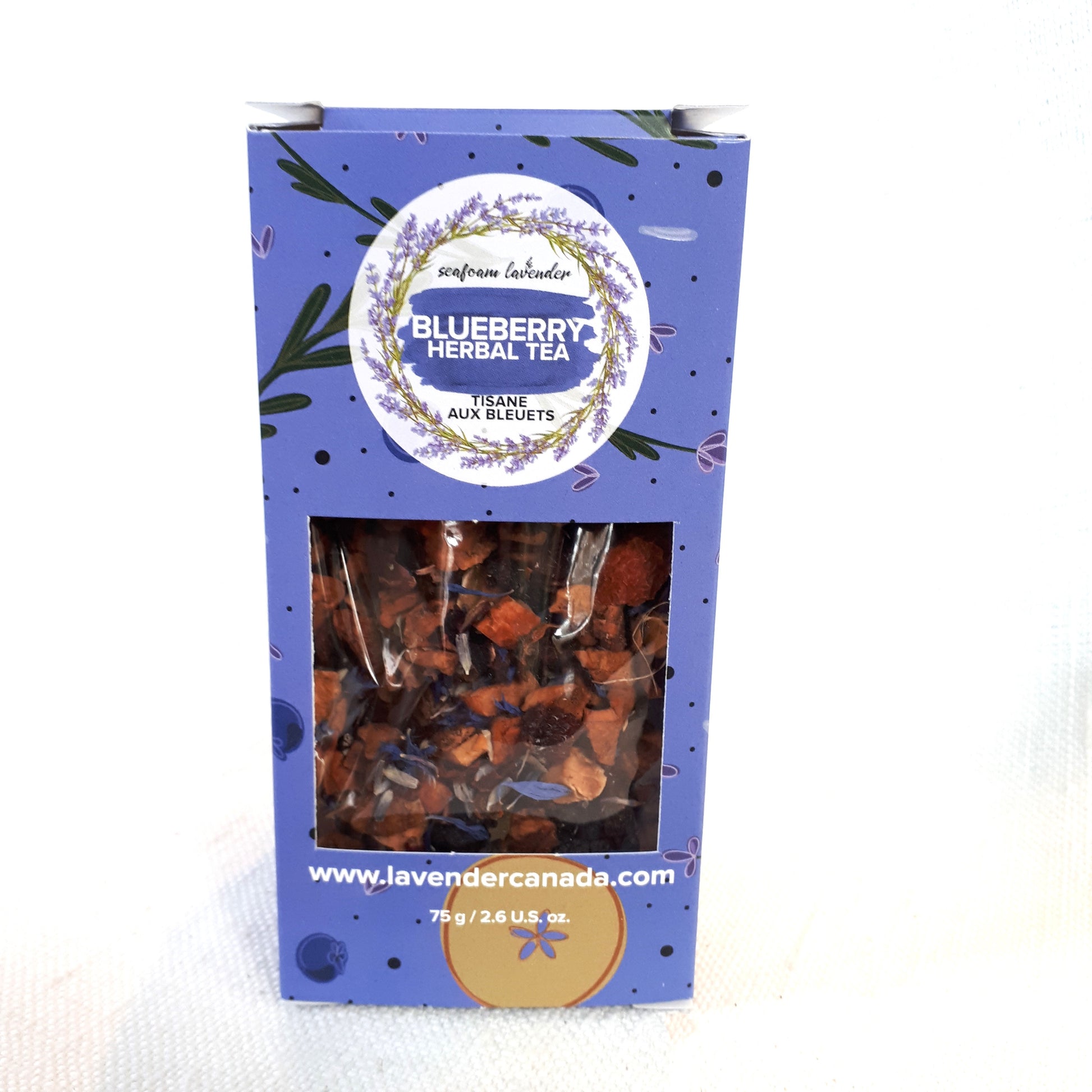 - Blueberry - caffeine-free herbal tea with hibiscus, blueberries, orange peel, and rose hips, and lavender